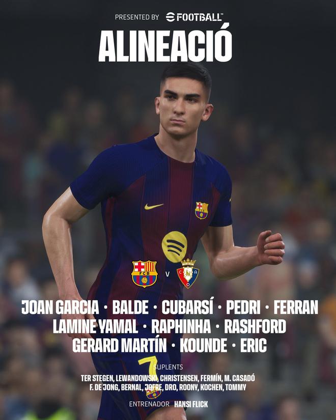 巴萨vs奥萨苏纳:亚马尔领衔,拉菲尼亚、拉什福德首发
